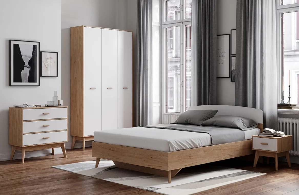 Вы можете купить кровати из массива, с мягким изголовьем или шкаф. Все элементы должны подходить под габариты помещения. Важно определиться с материалами. Мебель должна сочетаться с цветовым оформлением стен, потолков, занавесок или жалюзи.