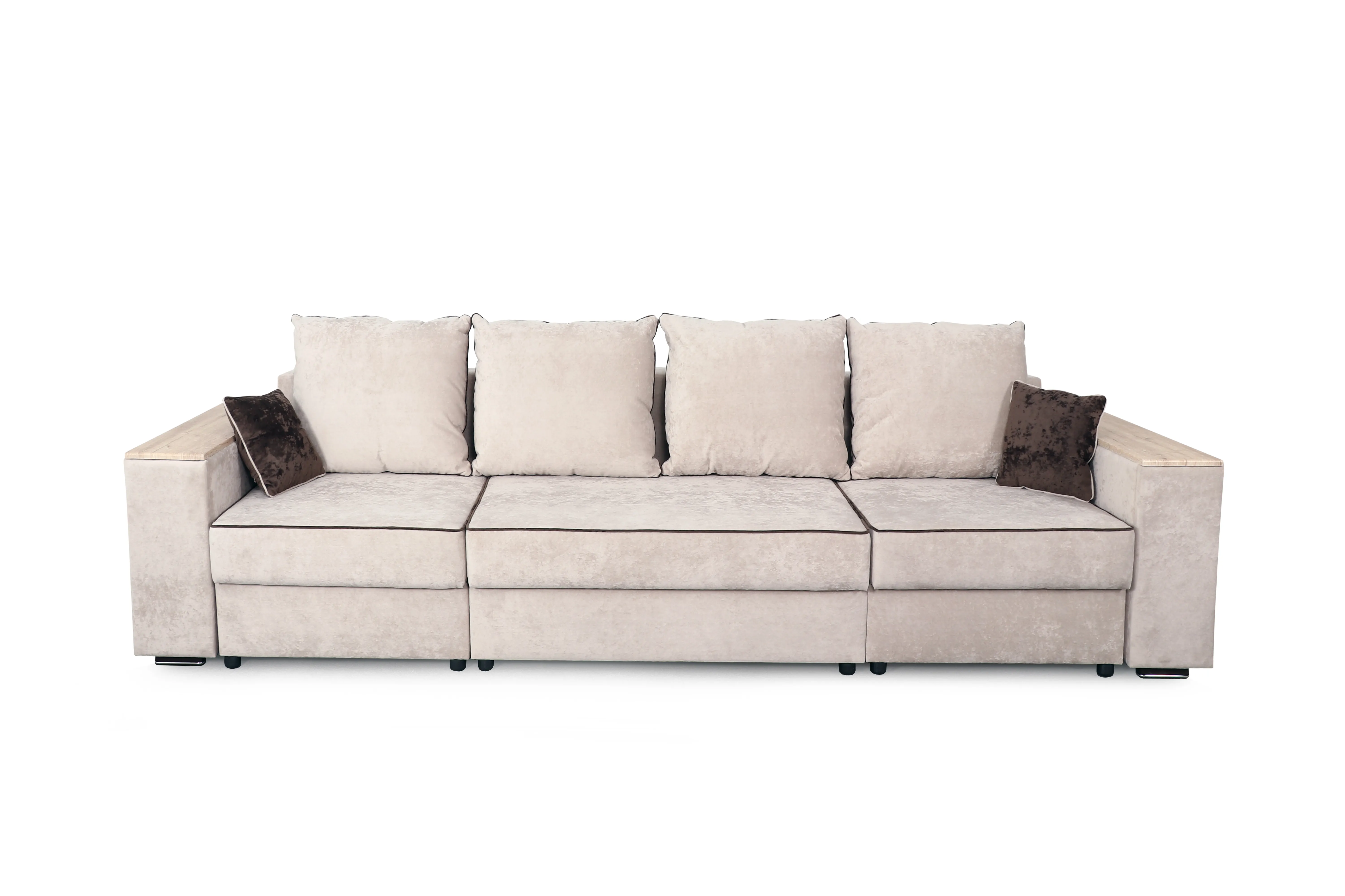 С одной стороны расположена боковина с нишей, с другой – ящики. Надежные петли с доводчиками добавляют комфортности использования мебели. Диван-трансформер может быть прямым, угловым и П-образным. Малые декоративные подушки входят в комплект дивана.