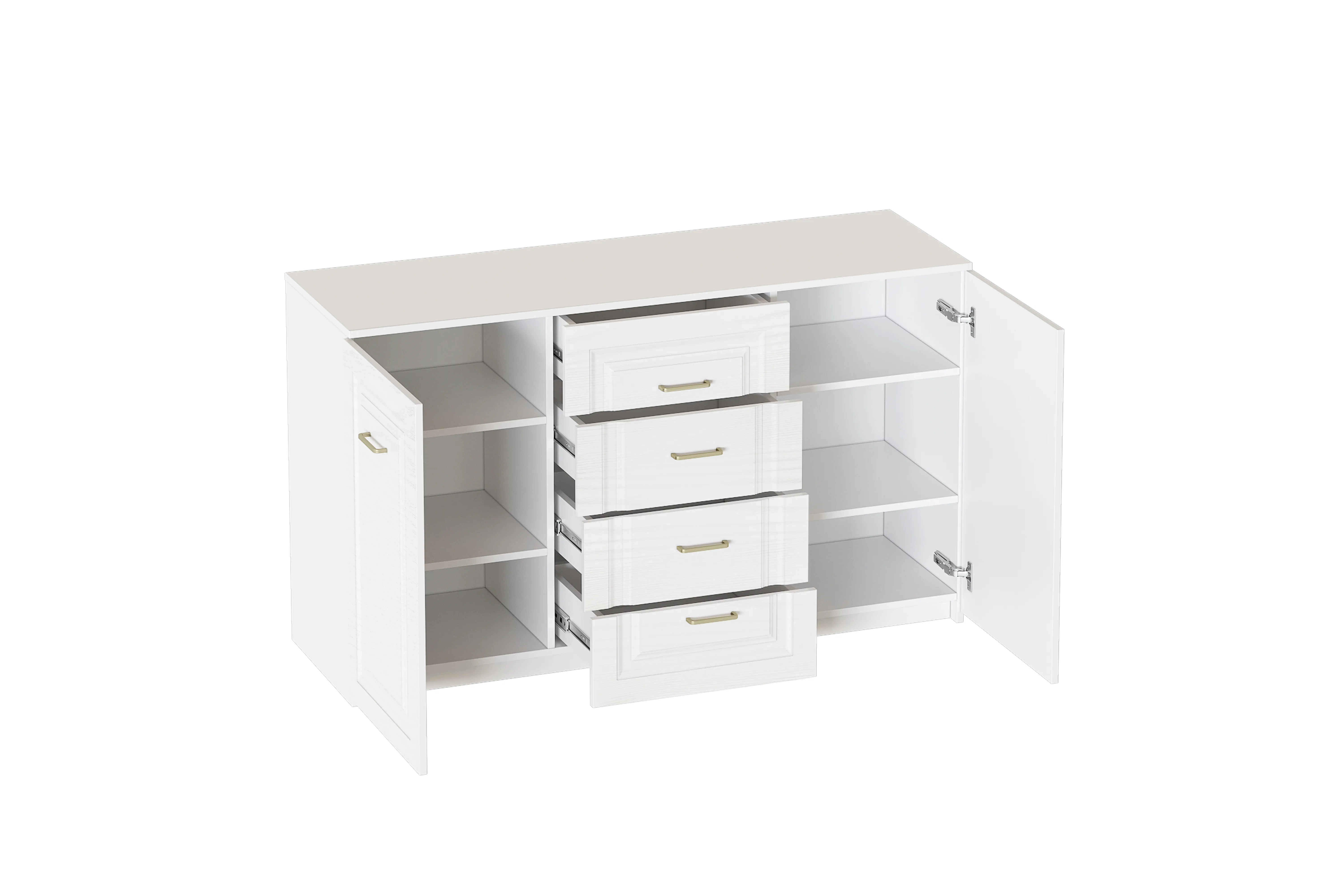 Комод выполнен в цвете Айс 06 / Белый Аляска. Классическая фрезеровка фасадов и ручки-скобы из брашированного золота придают изделию особый шарм и элегантность. Комод с полупроходными боками, прямоугольной крышкой и дном. Внутри пространство разделено на три секции. В средней секции расположены 4 ящика на шариковых направляющих без доводчика, крайние секции закрыты распашными дверями на петлях с доводчиком, за которыми расположены съемные полки. Дно и задние стенки выполнены из ХДФ. На опорах размещены войлочные подпятники.