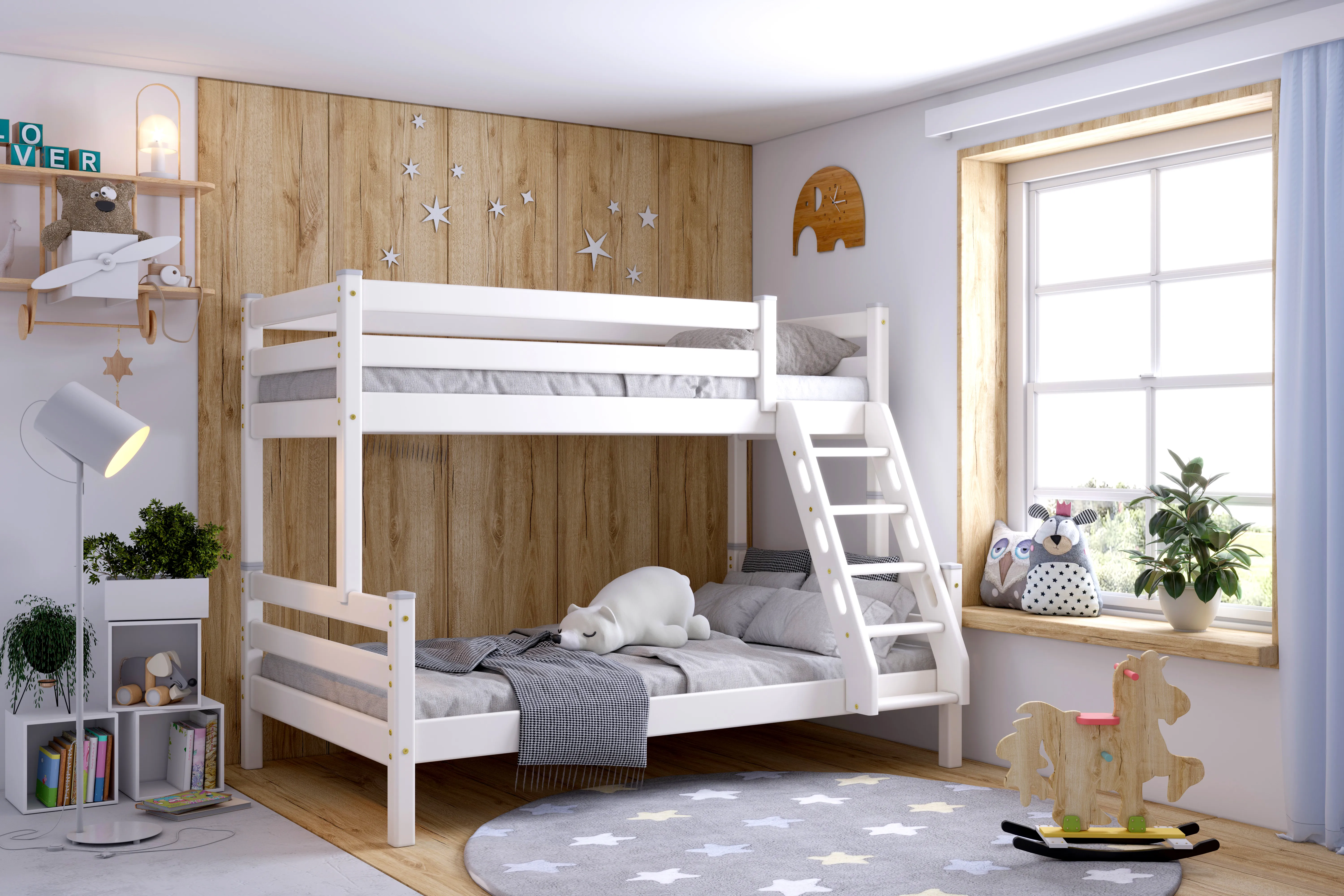 Увеличенное до 120 см по ширине спальное место нижнего яруса подходит для подростка, чей вес не превышает 70 кг. Верхнее основание имеет вид гнутых ламелей, с усиливающей перемычкой по периметру, нижнее представлено опорными брусками с уложенным поверх них настилом из шлифованного МДФ 10мм. Массив сосны подвергнут тщательной шлифовке и покрыт безопасным лаком на водной основе.