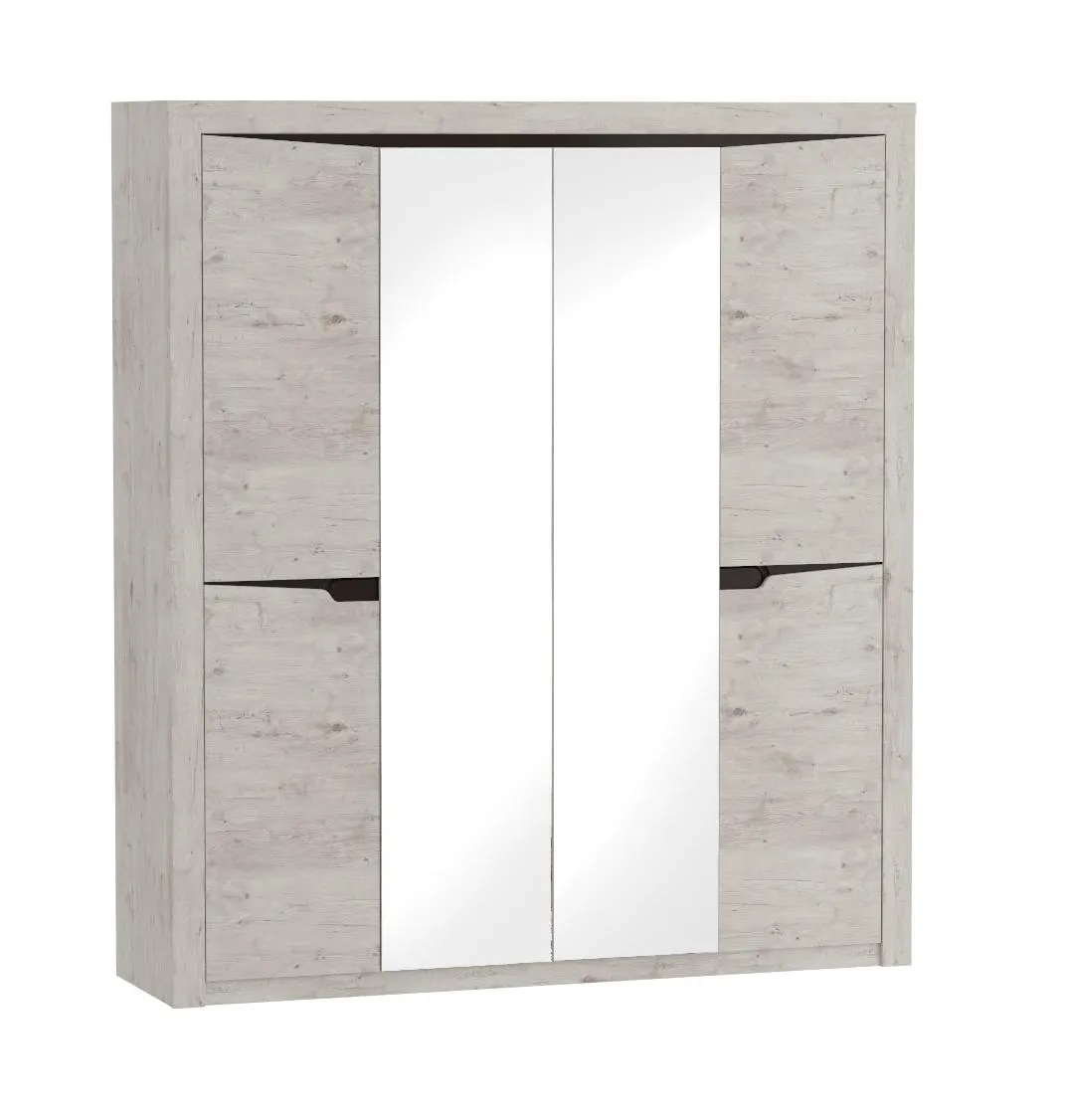 Четырёхдверный шкаф "Соренто" с зеркалом отлично подойдёт для спальни или прихожей и станет прекрасным дополнением к вашему интерьеру. На боковых дверях имеются декоративные вырезы, выполняющие функцию ручек. Одно из отделений шкафа можно изменить комплектом из трёх полок (приобретается отдельно).