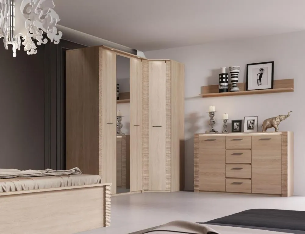 Трехдверный шкаф с зеркалом "Элана" оснащен двумя отделениями: для белья с четырьмя съёмными и центральной жёсткой полкой; платяное с жесткой полкой и продольной стальной штангой. В колпаке шкафа имеются пазы для двух светильников, входящих в комплект. Блок питания приобретается отдельно, и рассчитан на подключение шести светильников.