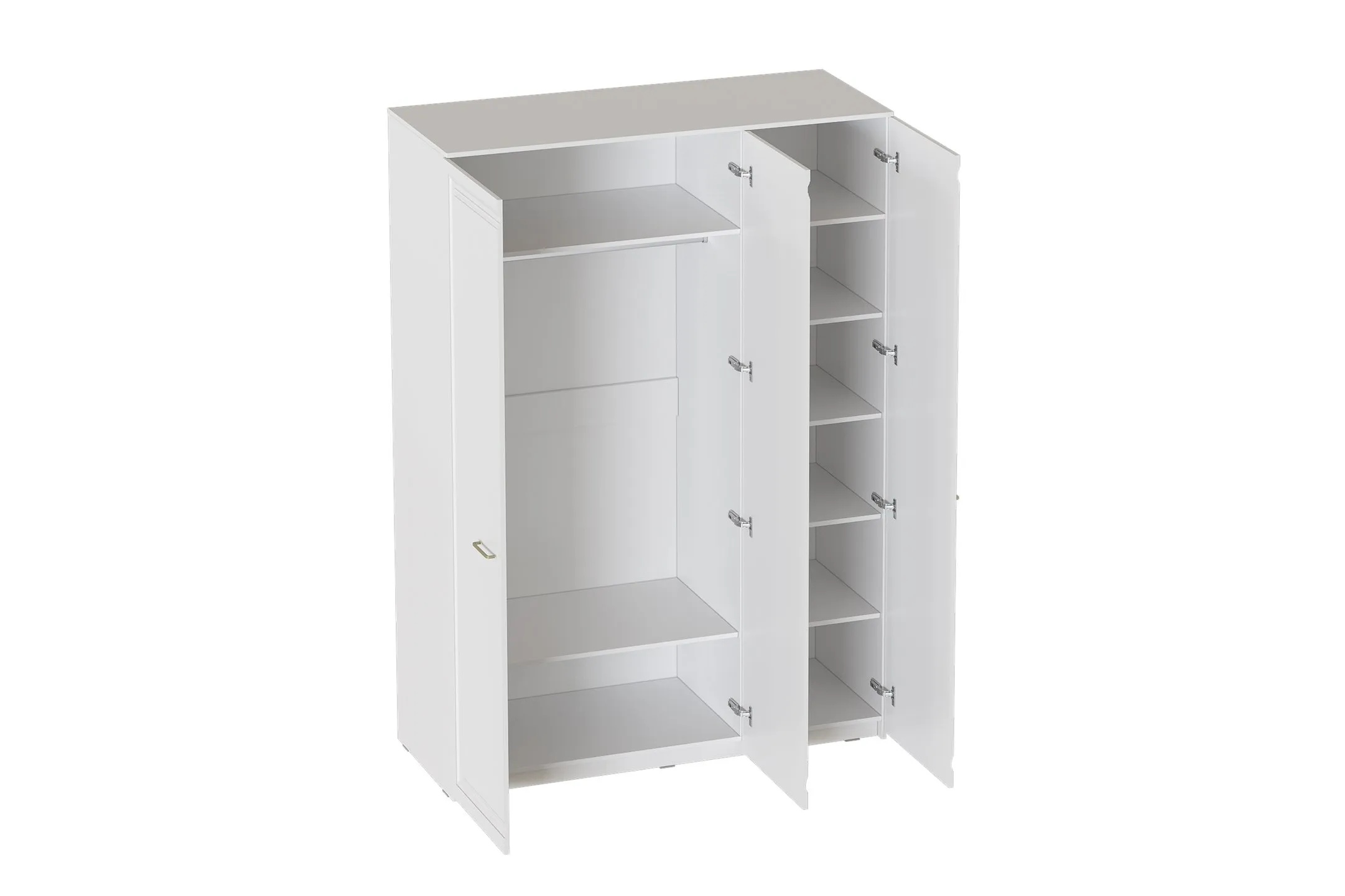 Шкаф выполнен в цвете Айс 06 / Белый Аляска. Классическая фрезеровка фасадов и ручки-скобы из брашированного золота придают изделию особый шарм и элегантность. Внутреннее пространство шкафа разделено на два отделения: слева находится отделение для одежды с одной большой стационарной полкой, одной большой съёмной полкой и продольной металлической штангой; справа находится отделение с одной небольшой стационарной полкой и четырьмя съёмными полками. Двери шкафа оснащены петлями с амортизаторами.