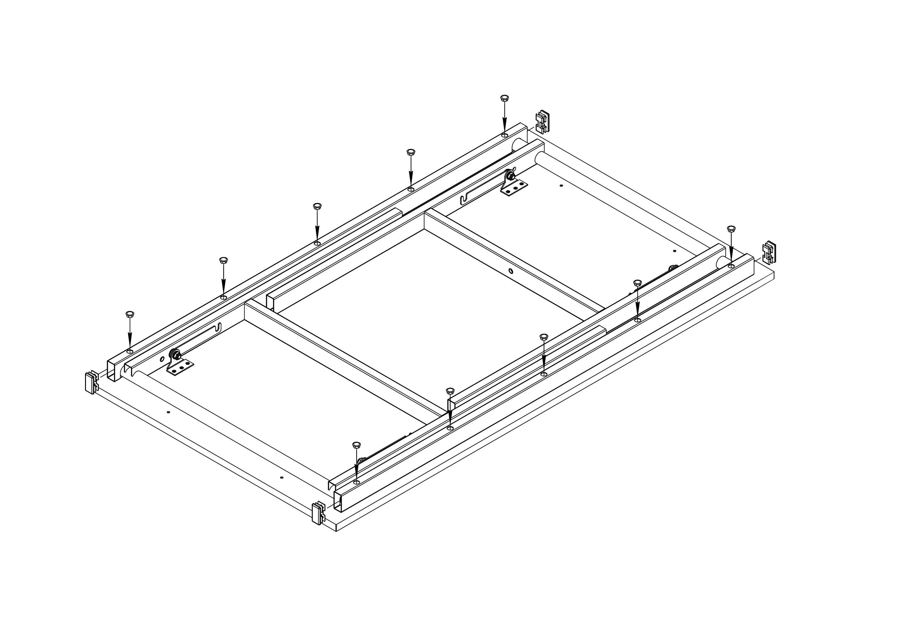 Раскладной стол "Брион 1" с прямоугольной столешницей. Опорами служат две раскладных металлические рамы, соединённые между собой сборной / разборной поперечиной. Рамы фиксируются крючками и затягиваются несъёмными винтами ("барашек"). Высота стола регулируется.