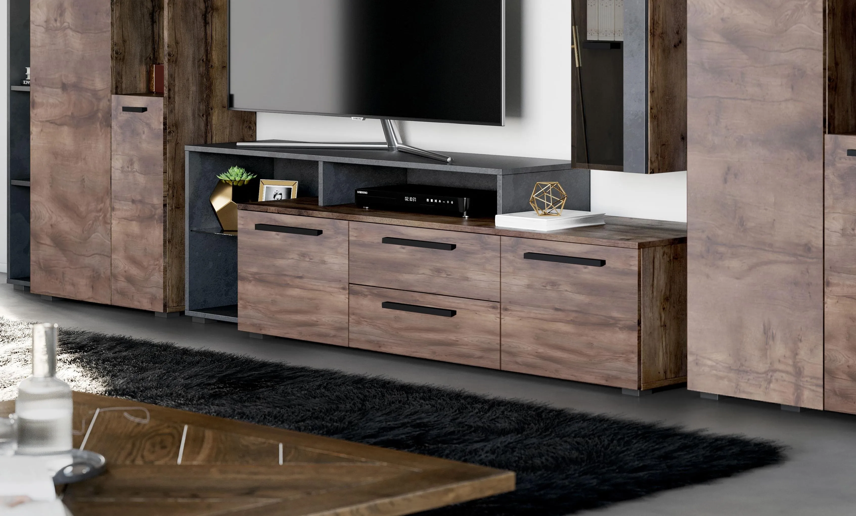 В центральной части располагаются два выдвижных ящика на шариковых направляющих, а по бокам расположены два отделения с полками и распашными дверями.